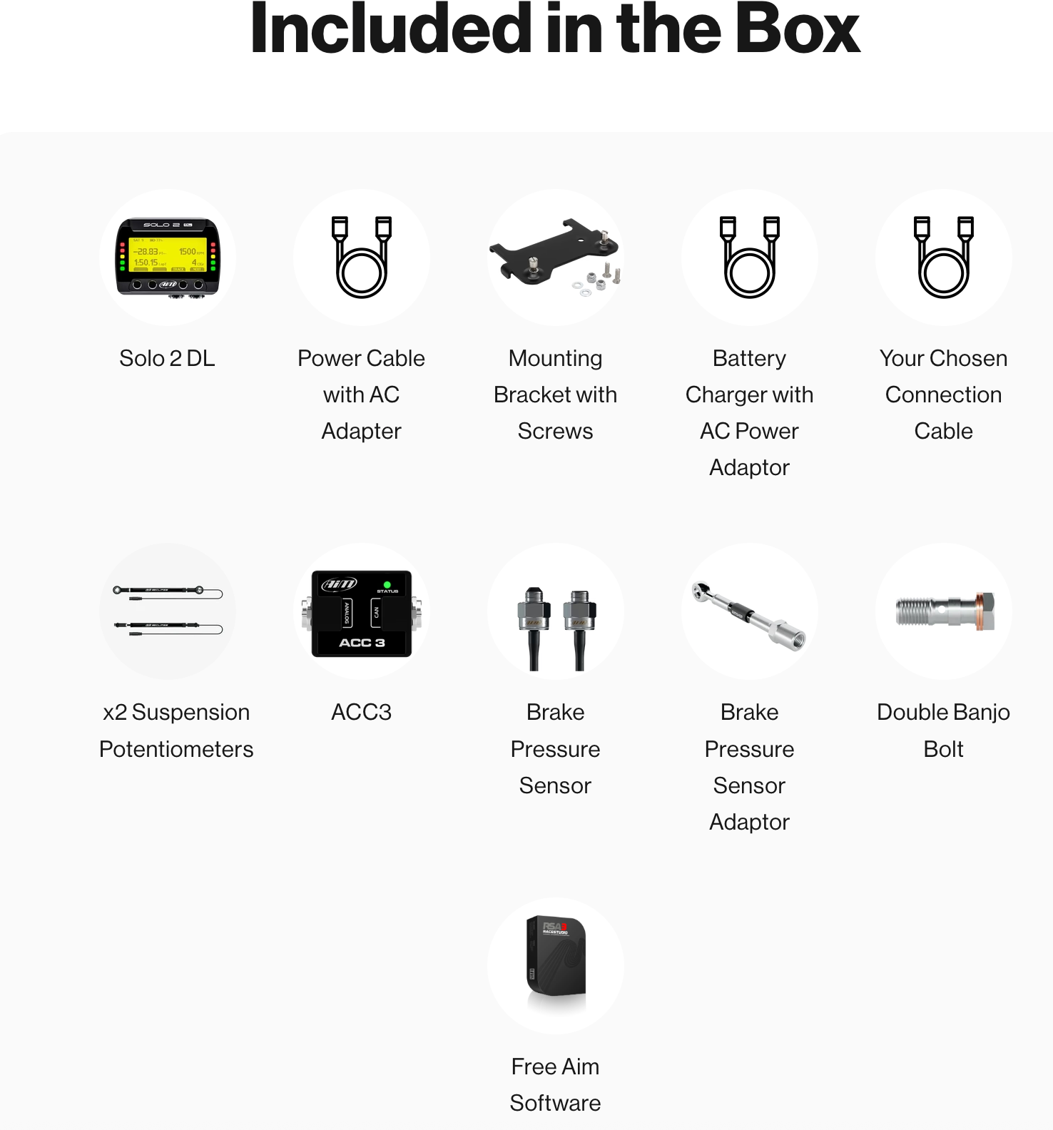 This plug & play kit with the Solo 2 DL gives you the ultimate track day experience. It includes the Solo 2 DL, 2 suspension potentiometers, an analogue CAN converter (ACC), a brake pressure sensor and a motorcycle-specific plug & play cable.
