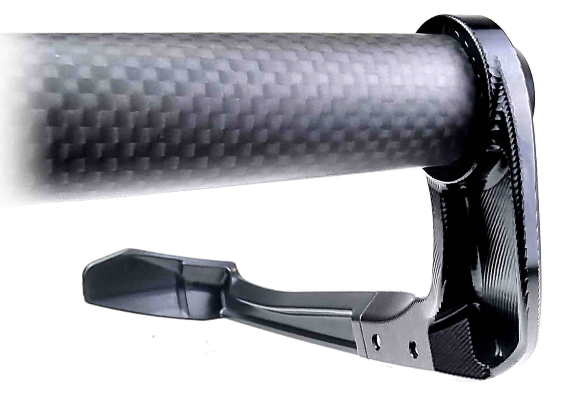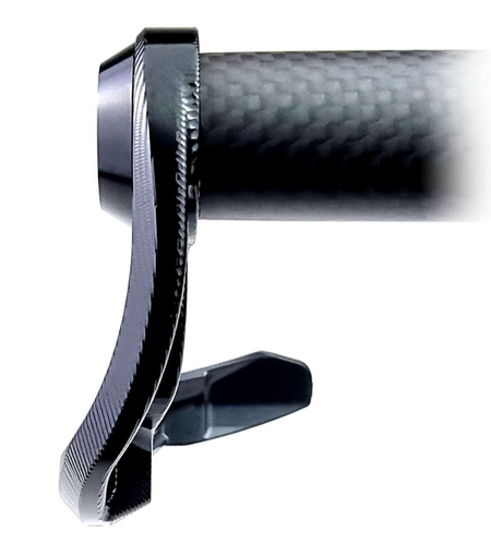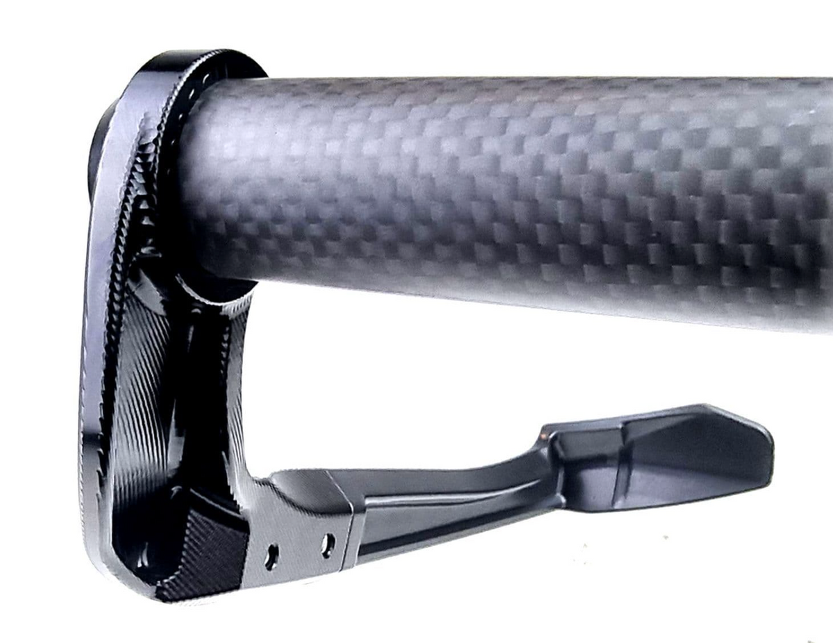 Machined from aerospace grade 7075-T6 aluminium for super strength. Incorporating a high-impact resistant delrin 'blade' which provides excellent impact resistance in the event of a collision, saving your front brake and clutch / rear hand brake from being accidentally applied.