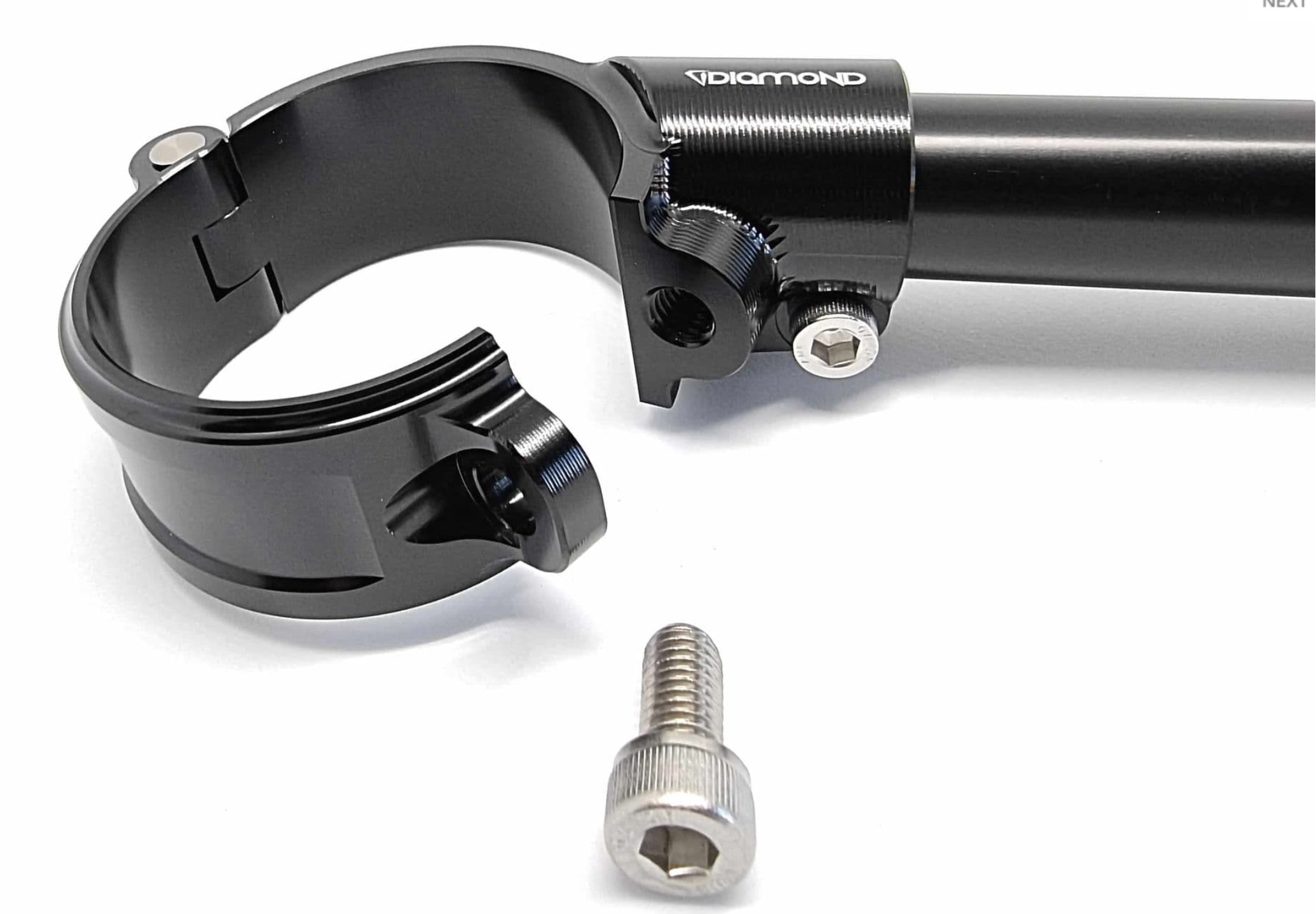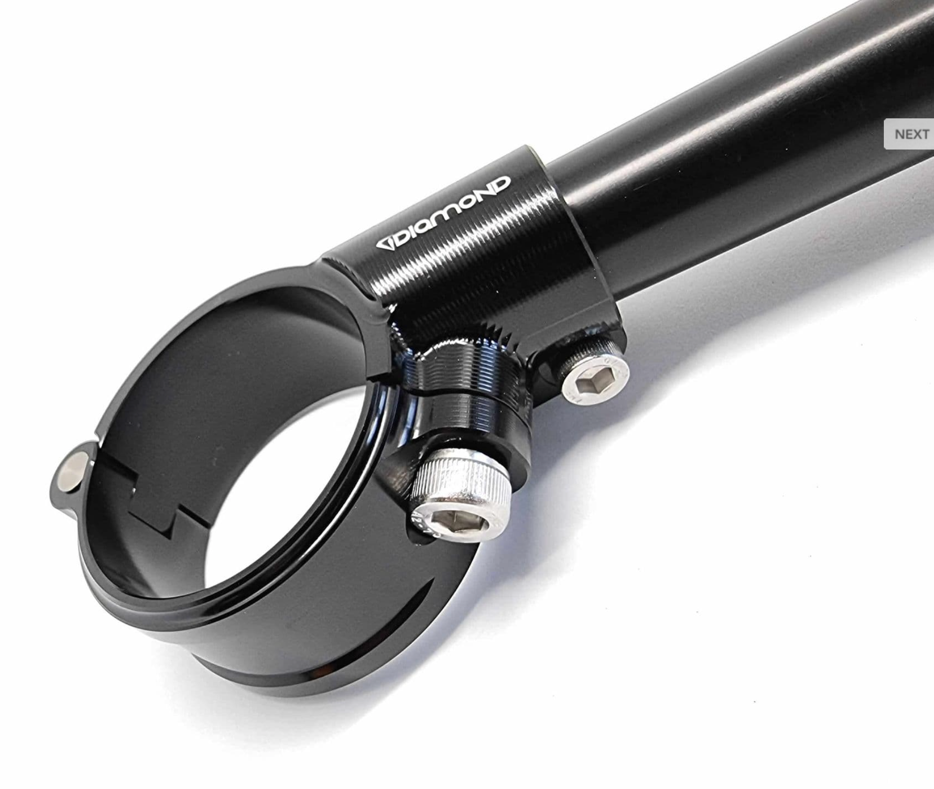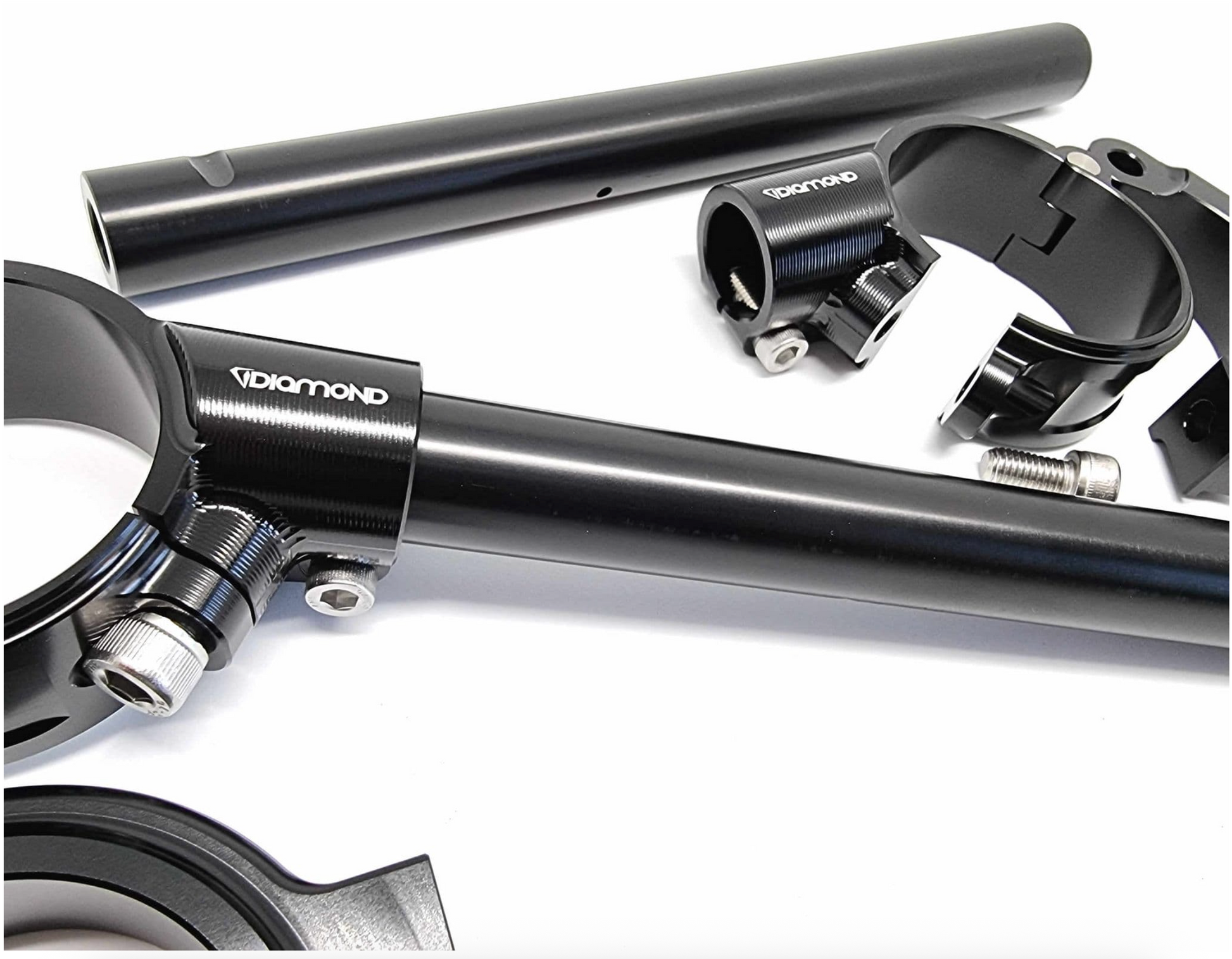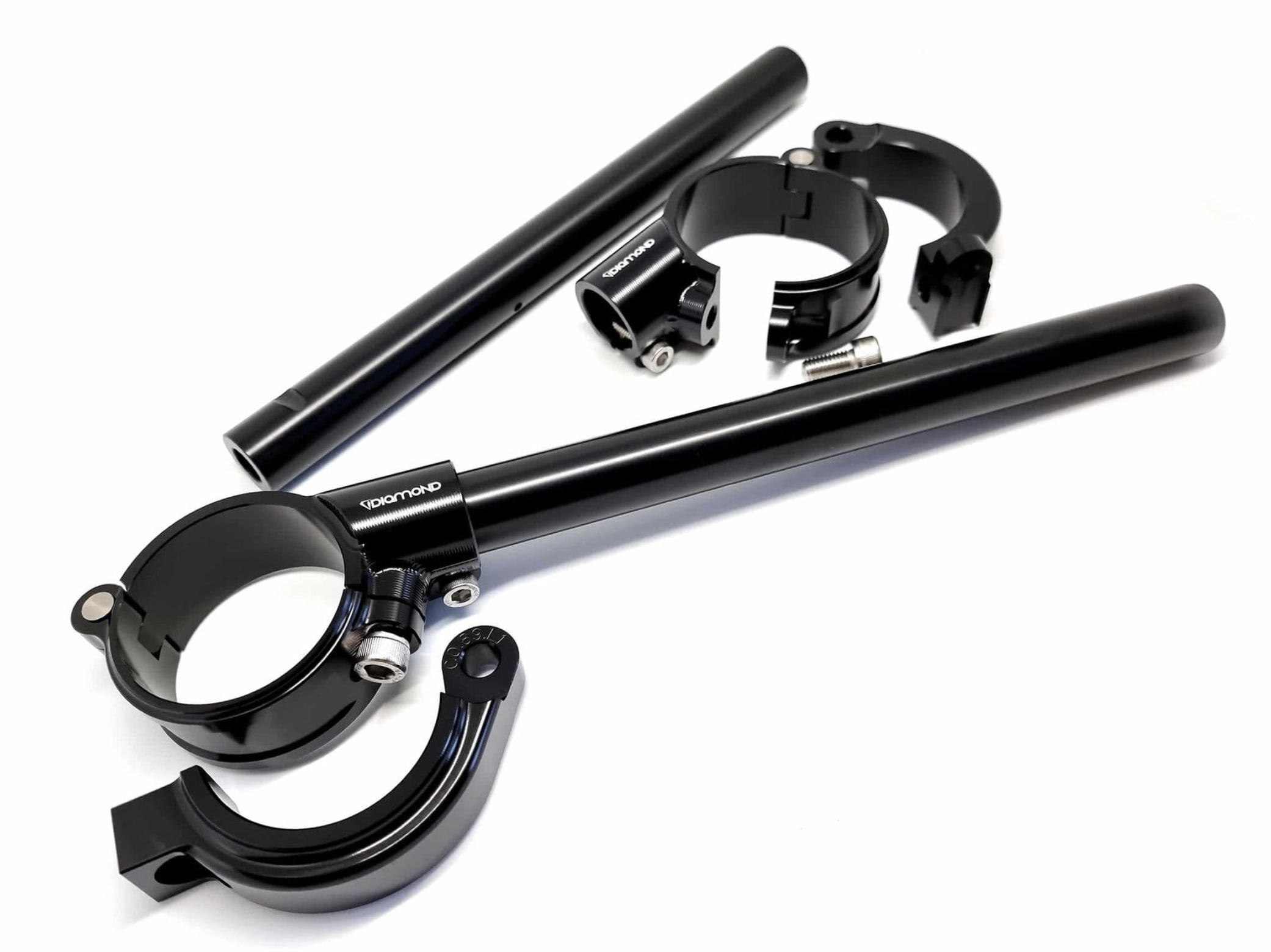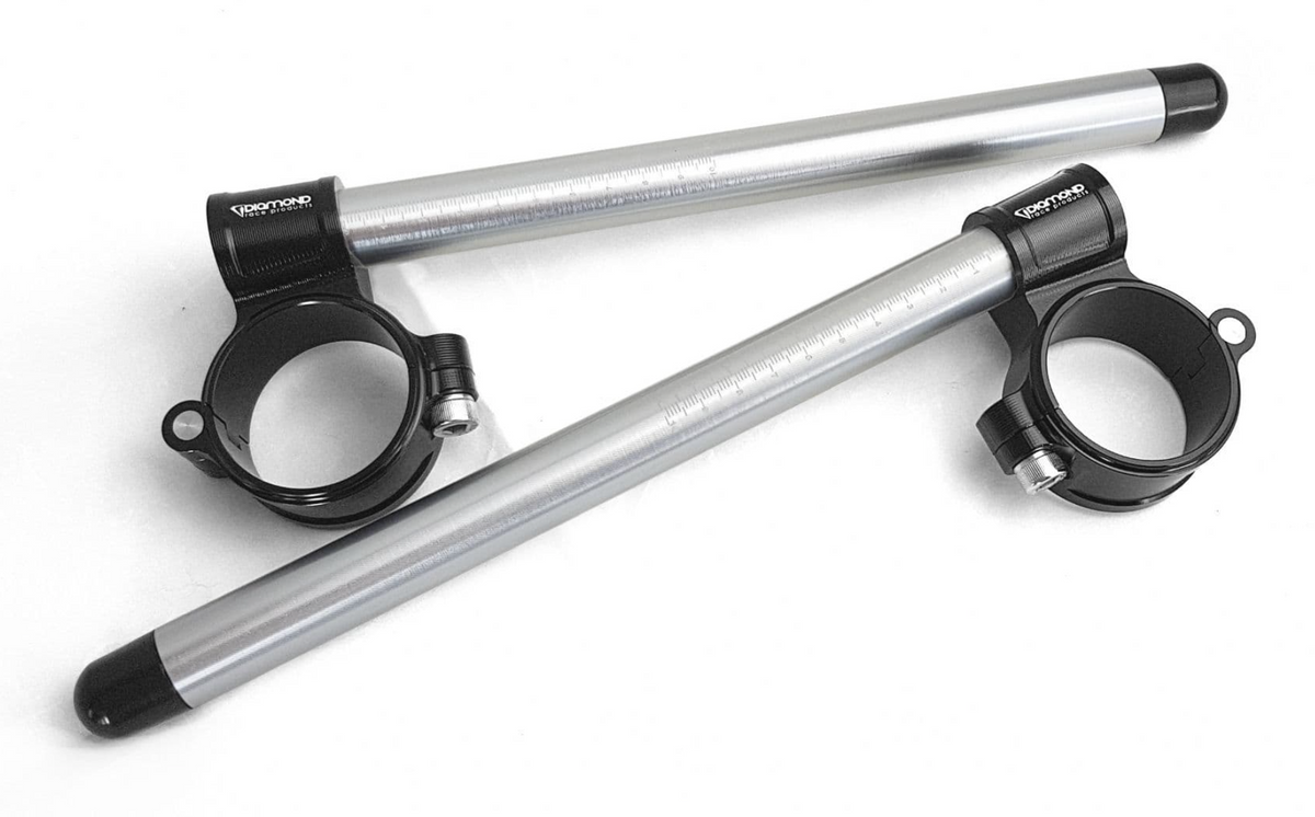 Ultra-lightweight 'pivot fit' clip-on handlebars by Diamond Race Products. Beautifully precision machined from billet 7075-T6 alloy and coupled with aerospace grade 2024-T3 tubes, resulting in one of the strongest, yet lightest clip-on's available on the market today.
