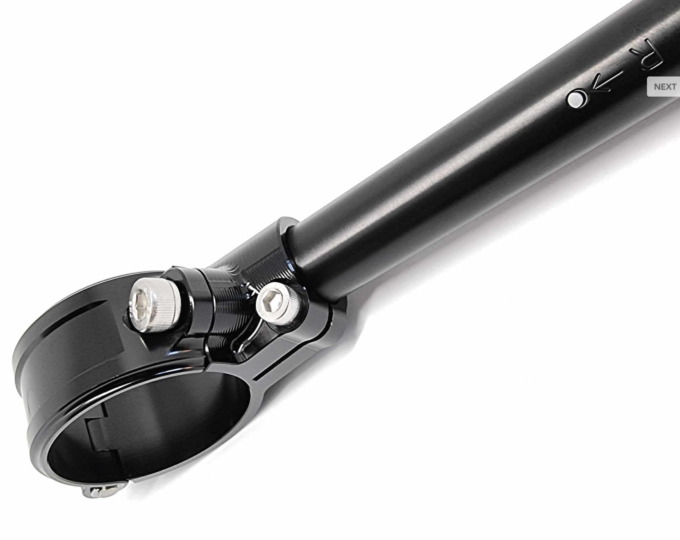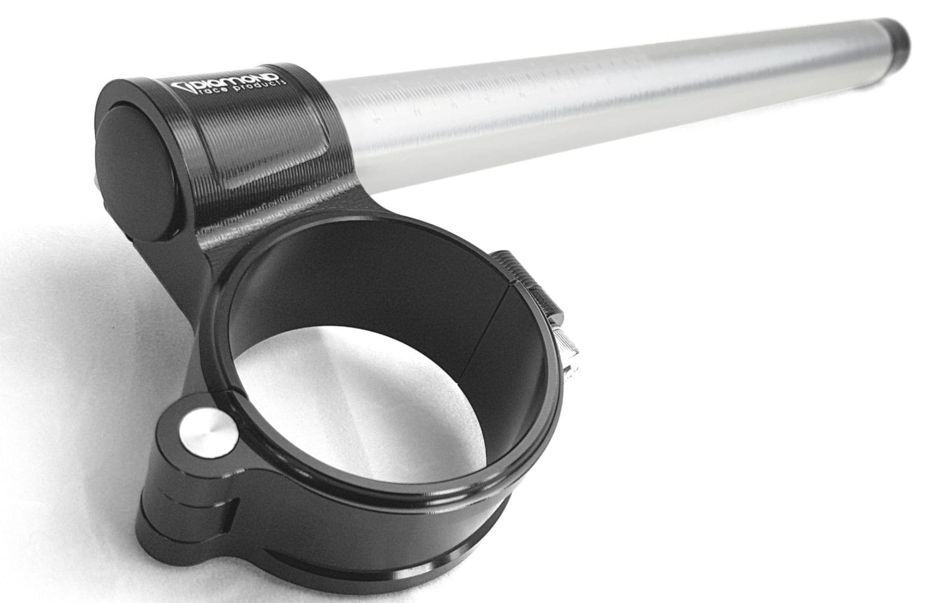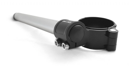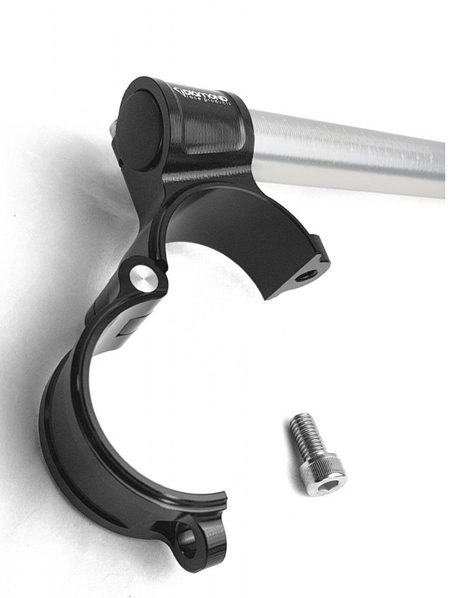 A 304 grade stainless steel hinge pin allows for ease of fitting and removal, without the need to drop forks or remove top yoke. The clamps are designed with a 10 degree downward angle for maximum wrist/arm comfort, reduced fatigue and precise front end feel. The beauty of the engineering throughout is highlighted by the flawless deep black hard anodised finish. - Supplied with high impact resistant delrin bar ends.