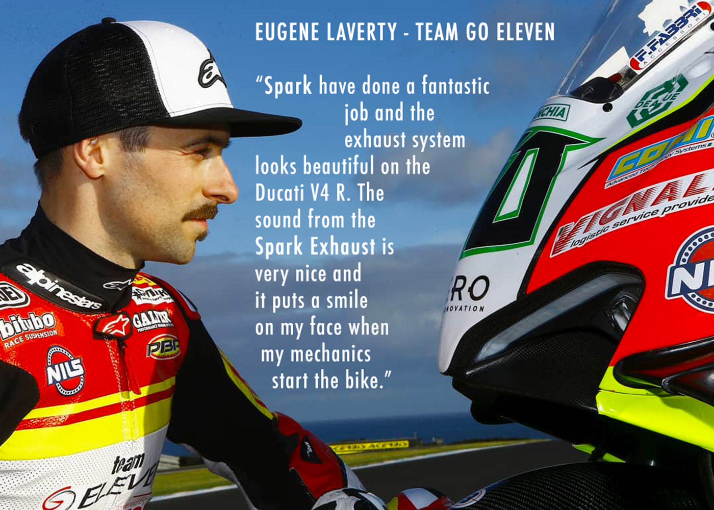 With great pride and joy Spark and Team Go Eleven renew their partnership for the 5th year in a row and with big news. The Piedmontese team will take part to the championship with Ducati Panigale V4 R. Go Eleven goes back to roots and chooses a great rider for such an important project: 25 victories and 56 podiums in Supersport and Superbike World Championships, 2 times vice world champion in Supersport, silver medal in 2013 world Superbike, Eugene Laverty will be the standard- bearer of team Go Eleven.