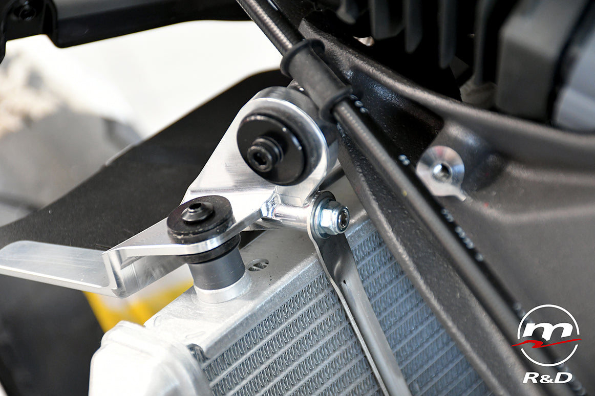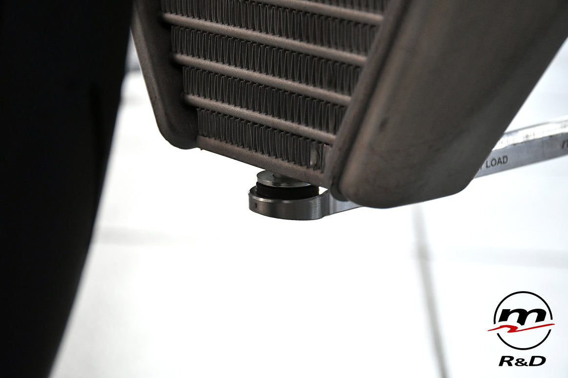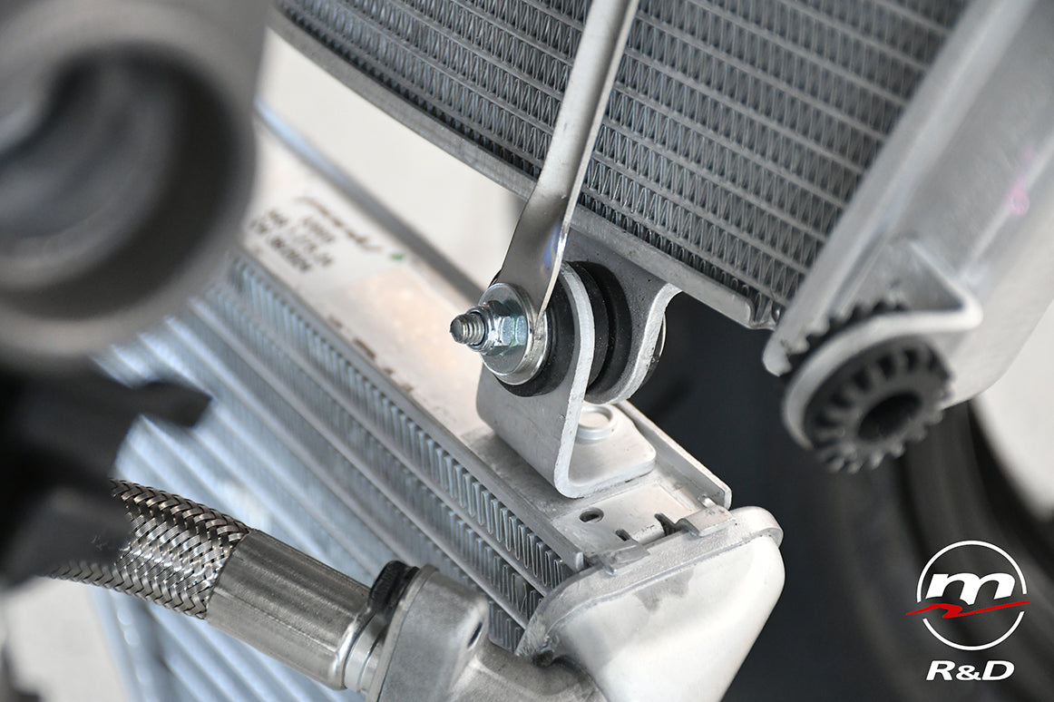 The kit is made up of several elements for a correct “elastic” fixing of the radiators and not compromising their structure, respecting the construction criteria with which Ducati developed this particular coupling between radiators and fairing: in fact, the manufacturer strongly advises against a rigid fixing on the supports welded above the water radiator as they are not load-bearing.