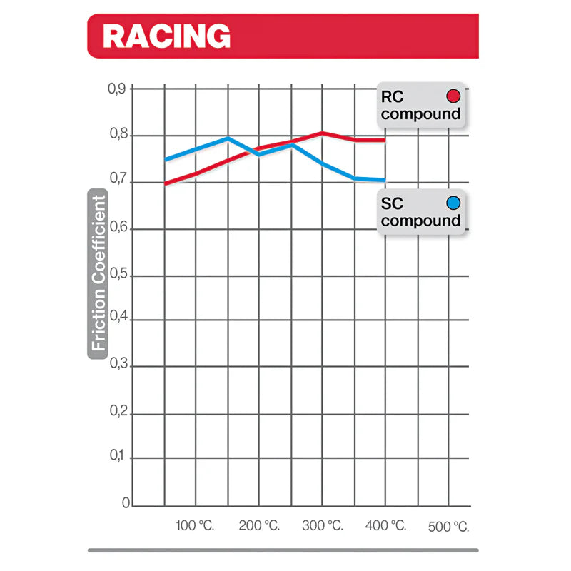With an excellent friction coefficient and - more especially - exceptional stability at very brake high temperatures found on track (250-400 degrees), this compound gives constant braking lap after lap, from grid to flag.