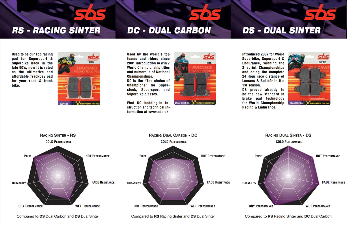 Used by the worlds top teams and riders since 2001 introduction to win 7 World Championship titles and numerous of National Championships. DC is the choice of Champions for Superstock, Supersport and Superbike classes. Find DC bedding-in instruction and technical information at www.sbs.dk