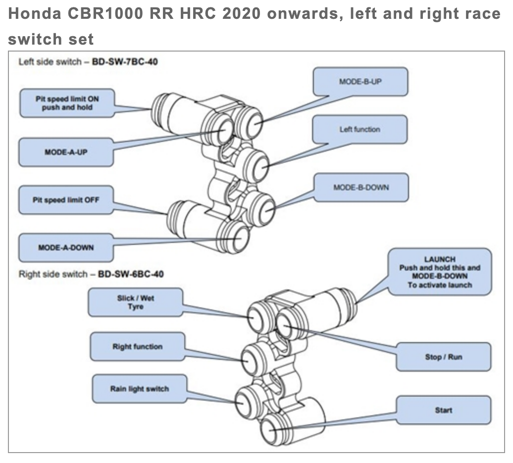 These left and right switch assemblies are designed for use on race/track bikes fitted with the HRC kit. For bikes with standard road bike ECU and wiring systems please see our other products.