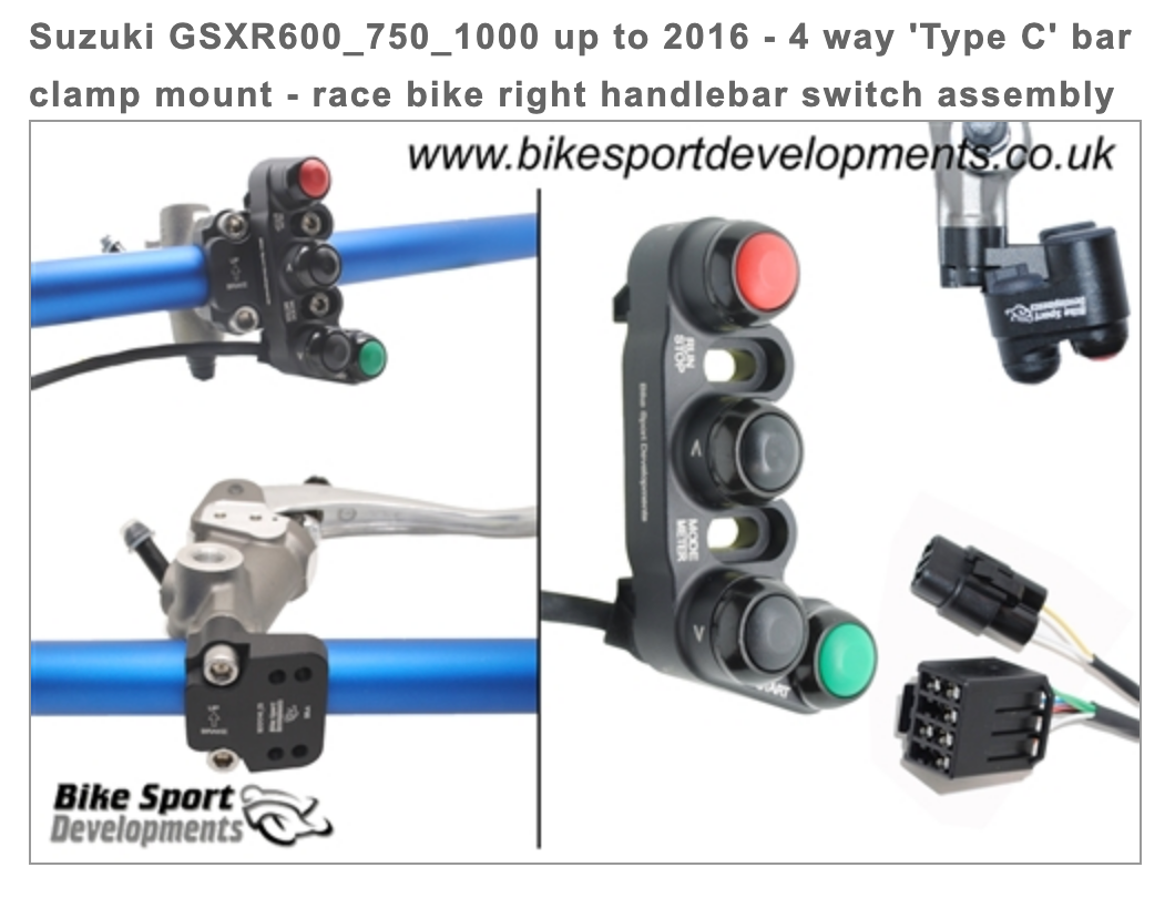 Suzuki GSXR600_750_1000 up to 2016 - 4 way 'Type C' bar clamp mount - race bike right handlebar switch assembly - Stop/Run Mode Up, Mode Down , Start