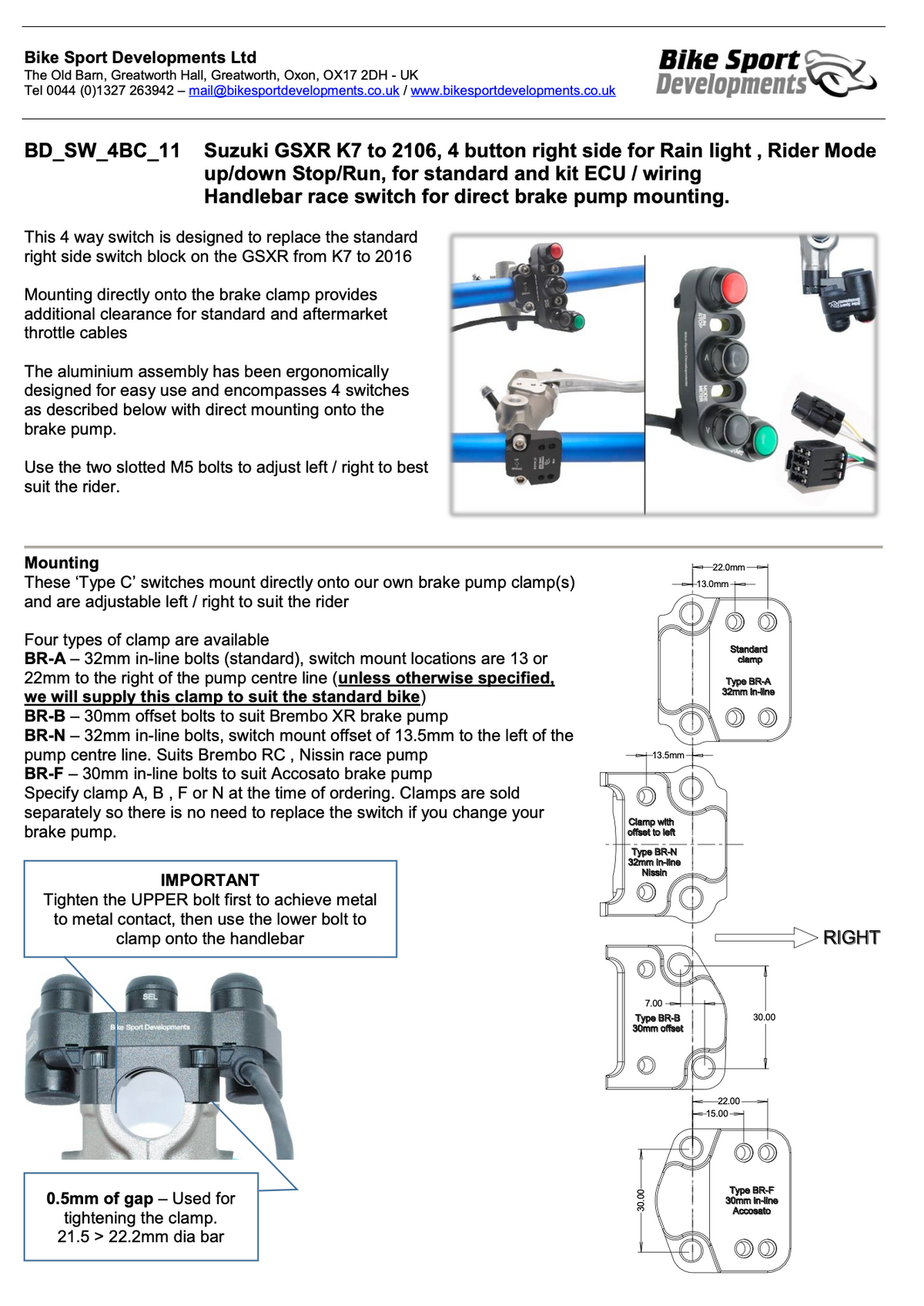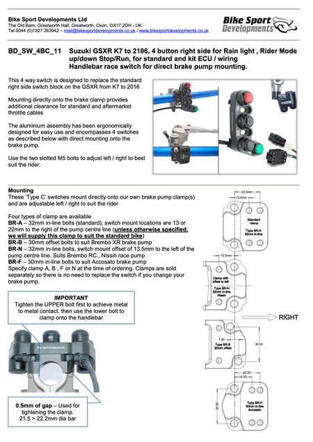 These 'Type C' switches mount directly onto the brake master cylinder using the two original clamp screws and a new dedicated clamp.