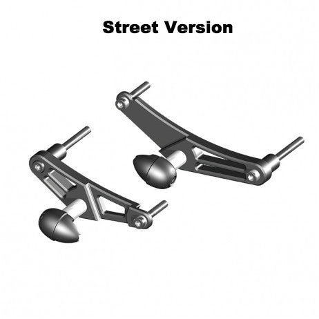 Street designed, for mounting beyond the fairing Reducing damage to the frame, fairing and other costly parts. Another point contact for sliding, in conjunction with engine case covers. Aluminum tubular design absorbing impact and distortion. Bolt cap head is always 5mm away from stock mounting position - minimising the leverage. Low cost bullet moulding replacement.