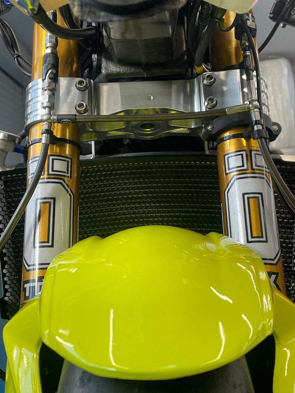 Before shipping the triple clamps, we add a cobalt base anti-seize paste on the insert and fork bolts. We also apply the blue Loctite solution to the smaller accessory bolts.