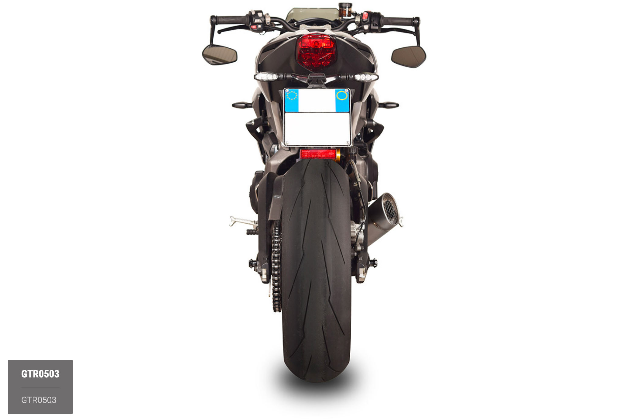 The first proposal recalls the successful Euro 4 previous version: the new box with catalytic converter is combined with an extremely aggressive low-mounting silencer. It is possible to choose exactly the same Grid-O silencer of the Moto2 World Champion 2020, full titanium, with visible tig welding (GTR0503) or the super aggressive MotoGp silencer (GTR0504), round and very short, available in titanium or dark style, with a large outlet diameter emphasizing the 3-cylinder sound.