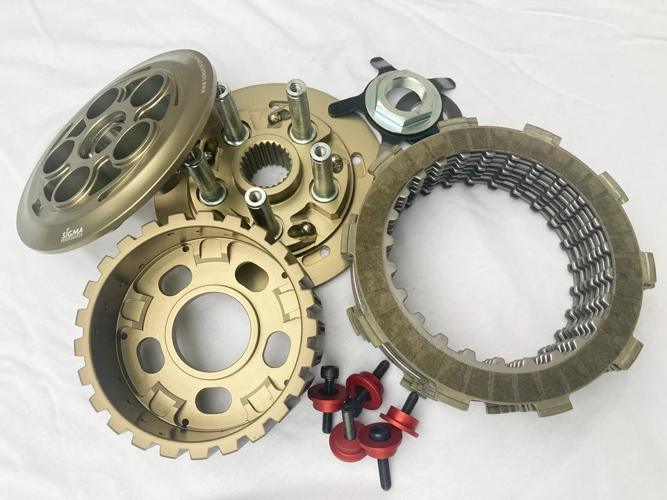 Our Sigma Slipper clutch, with its heavy duty clutch plates, is capable of taking the power of a top spec 765 engine. Our clutch is a simple slipper only; clutch so you don’t have to deal with the standard clutch wanting to engage while you are feeling for the ‘bite point’ on the start line.