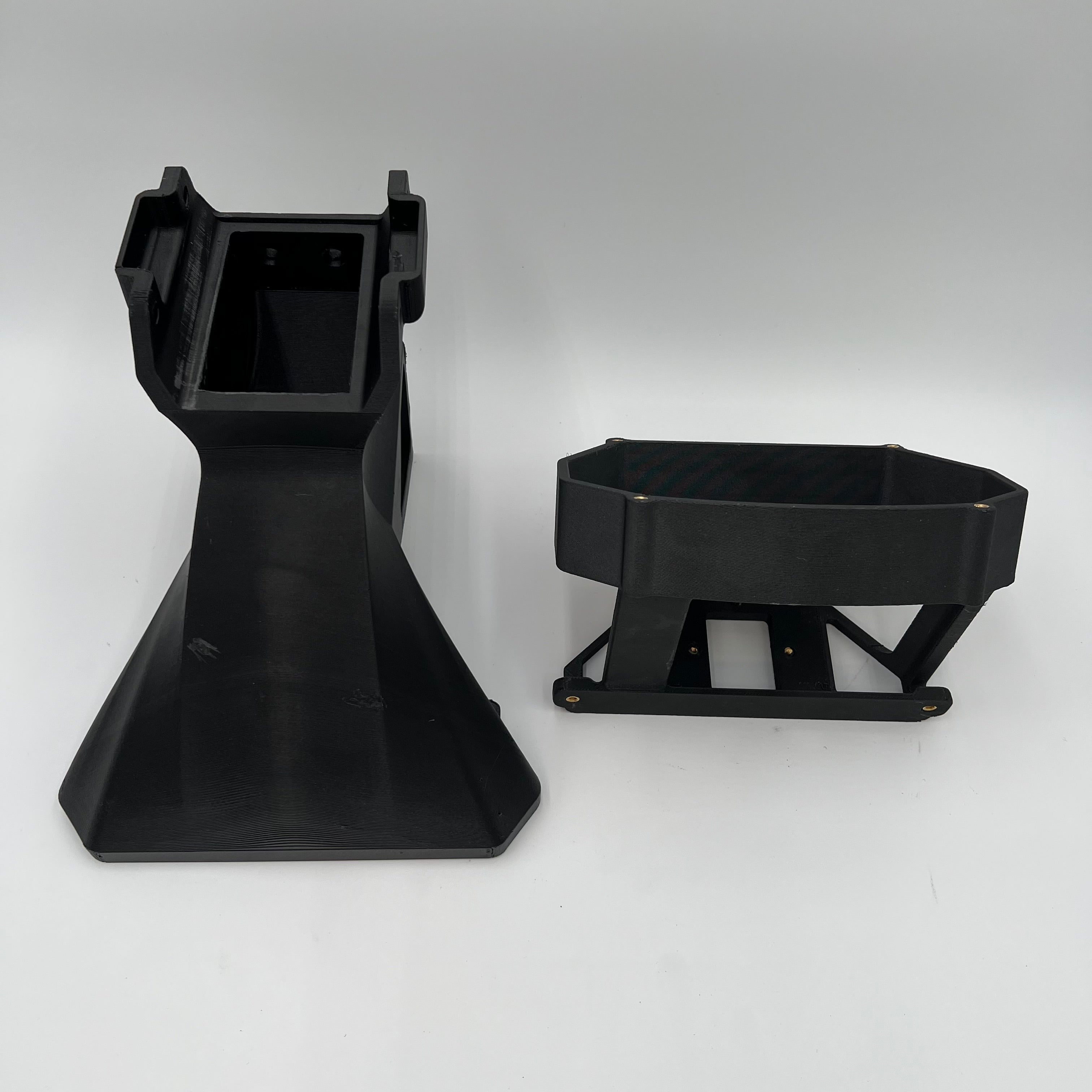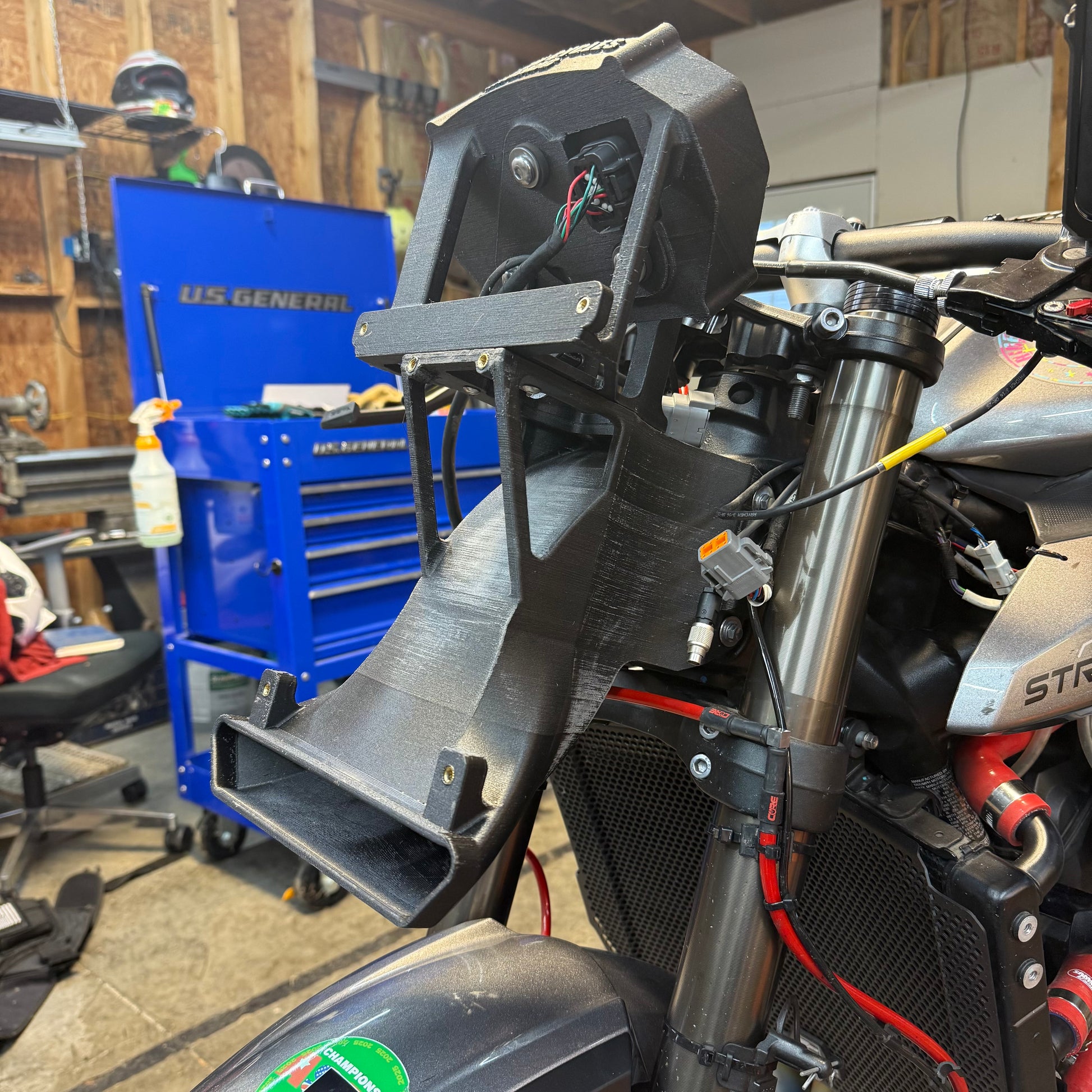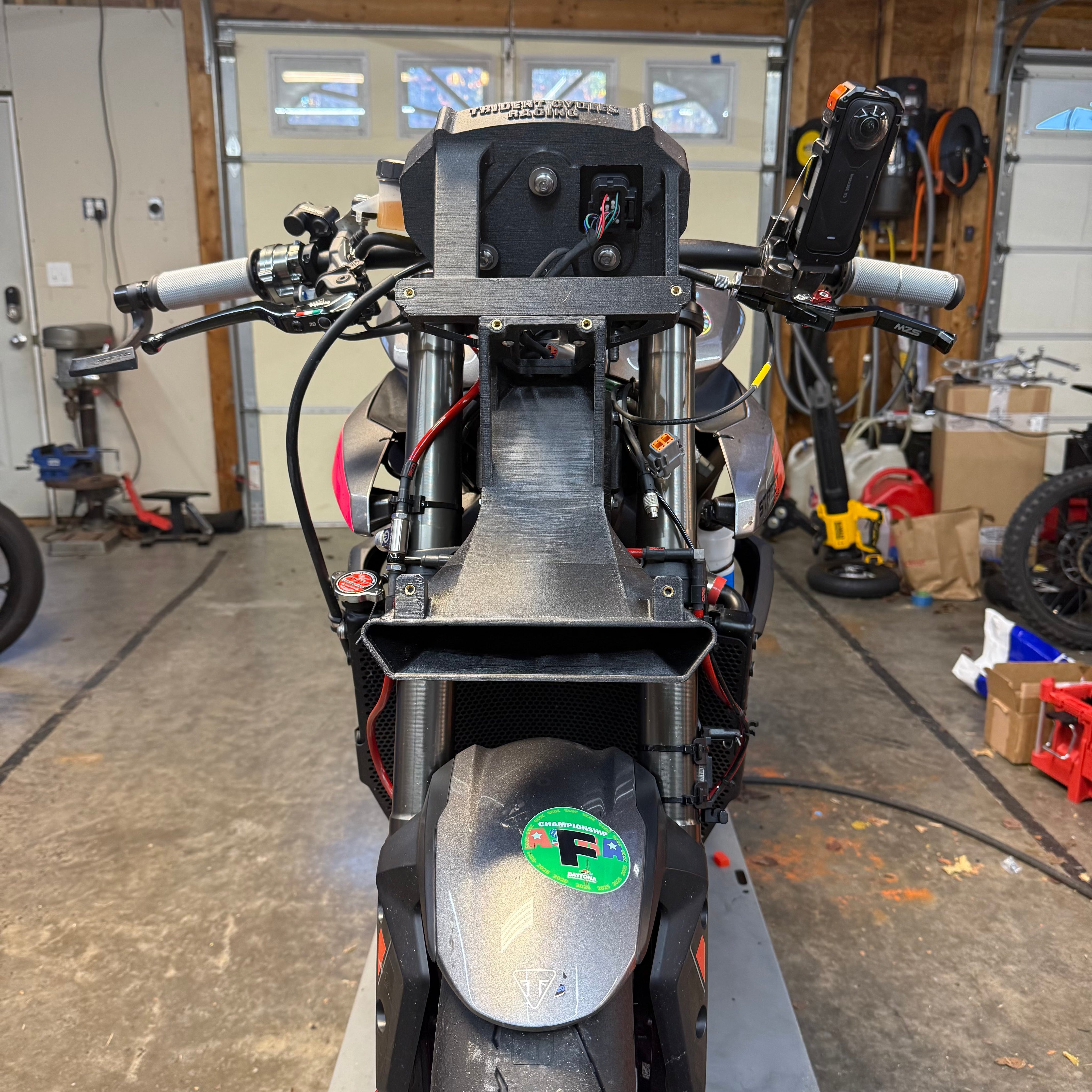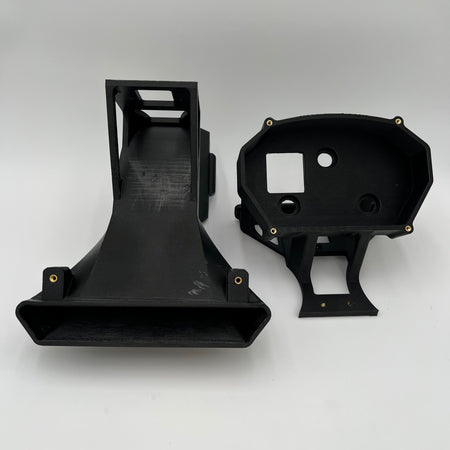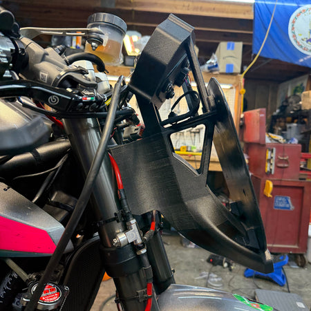 The front mount has a air duct that runs under the number board and into the head stock ensuring a healthy supply of fresh pressurised air to the airbox. The bracket is made to take a stock, ADU5 or AIM MXS dash perfectly. And adds valuable protection to the dash with the whole assembly being made from 3D Printed out of PETG-CF.