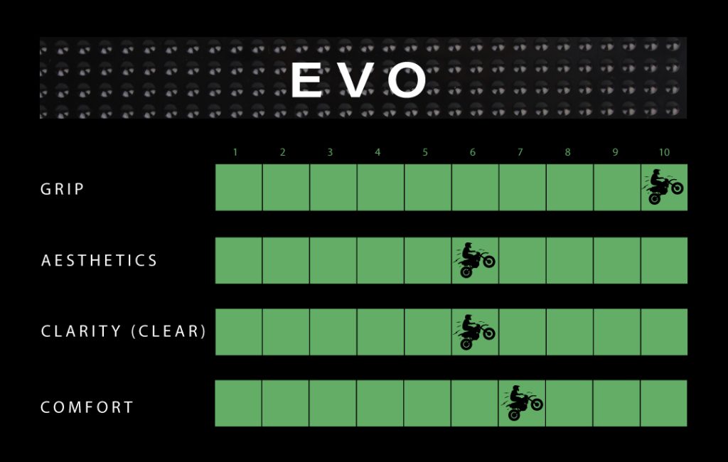The ‘Evo’ series tank grip features pronounced hemispherical traction domes.  Ideal for riders who want that added level of confidence by being able to feel the grip through their leathers.  Available in Black and Clear.