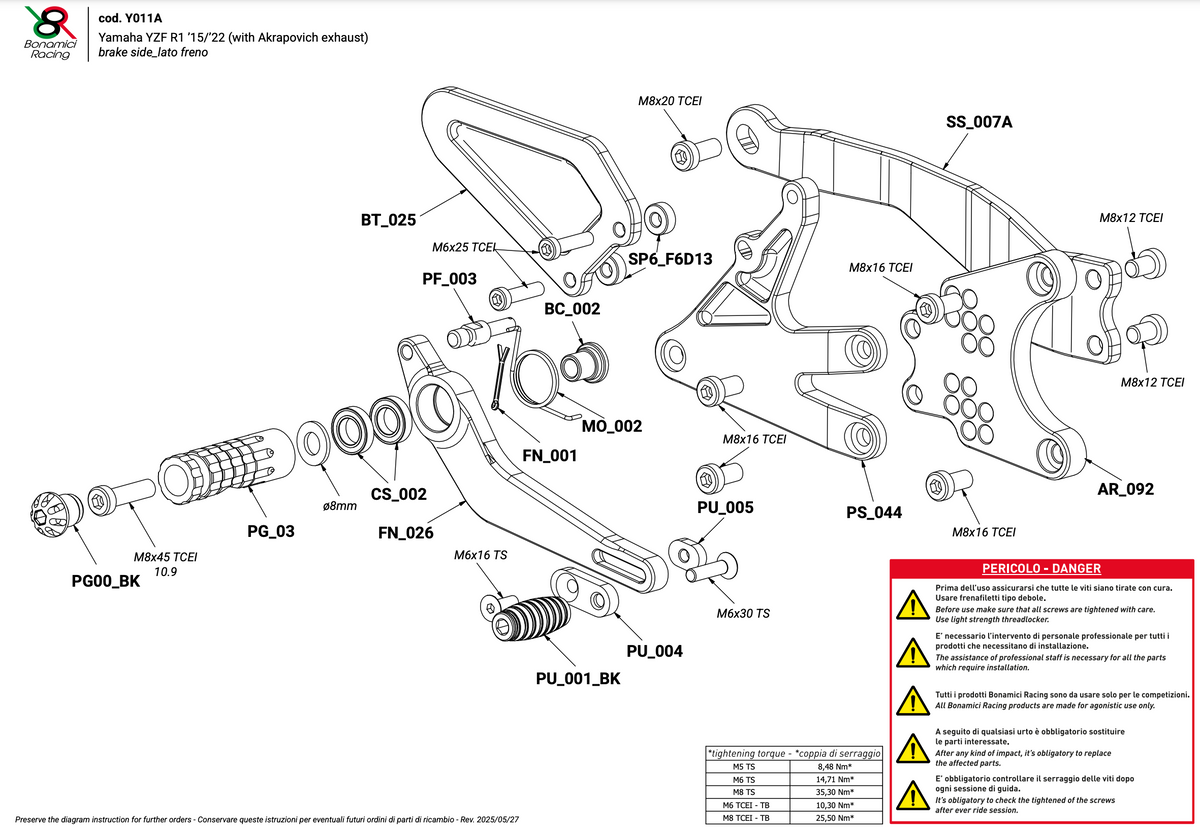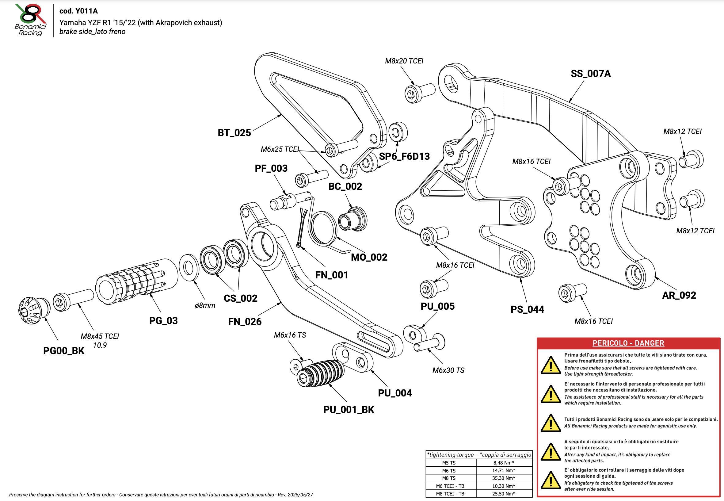 Yamaha YZF R1/M 2015-22 Bonamici Racing Rearsets (Akrapovic Exhaust)