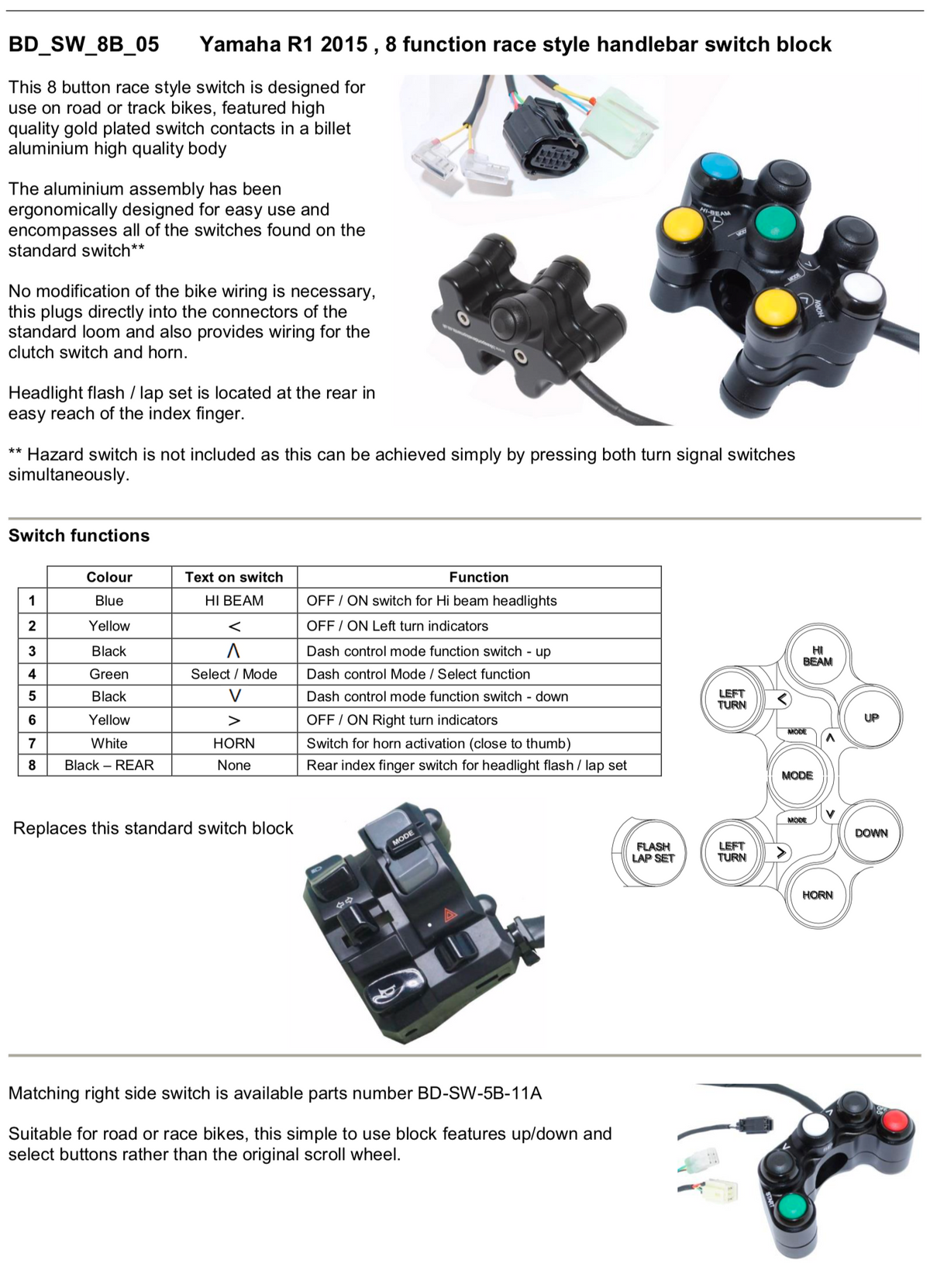 Yamaha R1 2015 onward - 8 function race switch - handlebar mount - All road functions
