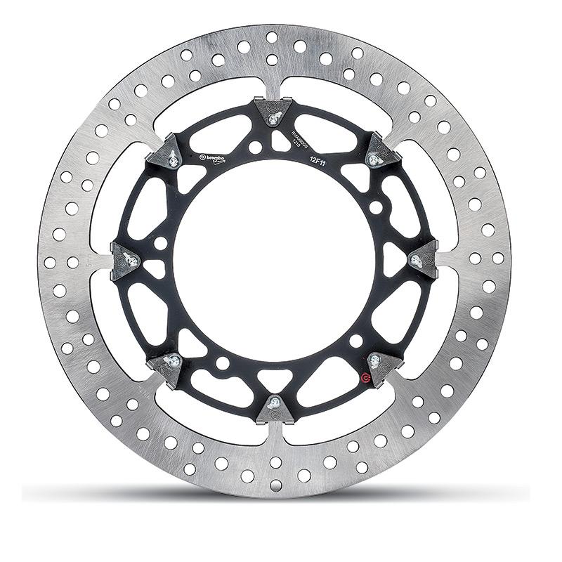 The connection between housing and rotor is ensured by a special guillotine hooking system (patent pending) which allows both radial and axial floating and reduces the overall weight of the disc, resulting in a significant advantage in terms of rideability compared to the traditional bushing system. Both performance consistency and the efficiency of disc and brake pads coupling during the running-in period have been significantly improved thanks to a rotor - in steel identical to that used for the discs in SBK and MotoGP - characterised by a new differentiated diameter hole pattern. The rotor height has also been optimised: maintaining a thickness of 5.5 mm, the height could be reduced to the advantage of containing weight and the moment of inertia with the consequential benefit of improved vehicle handling.