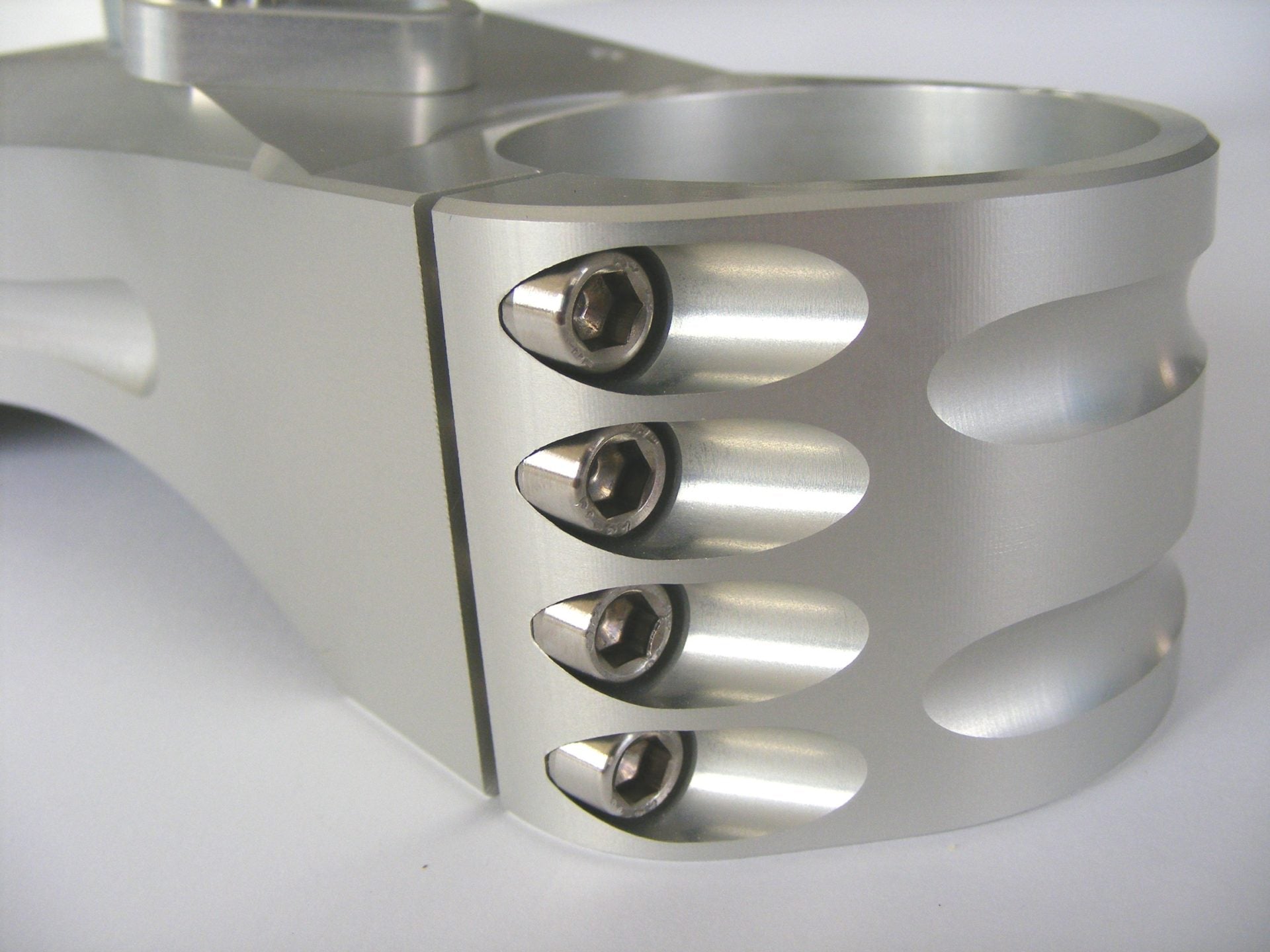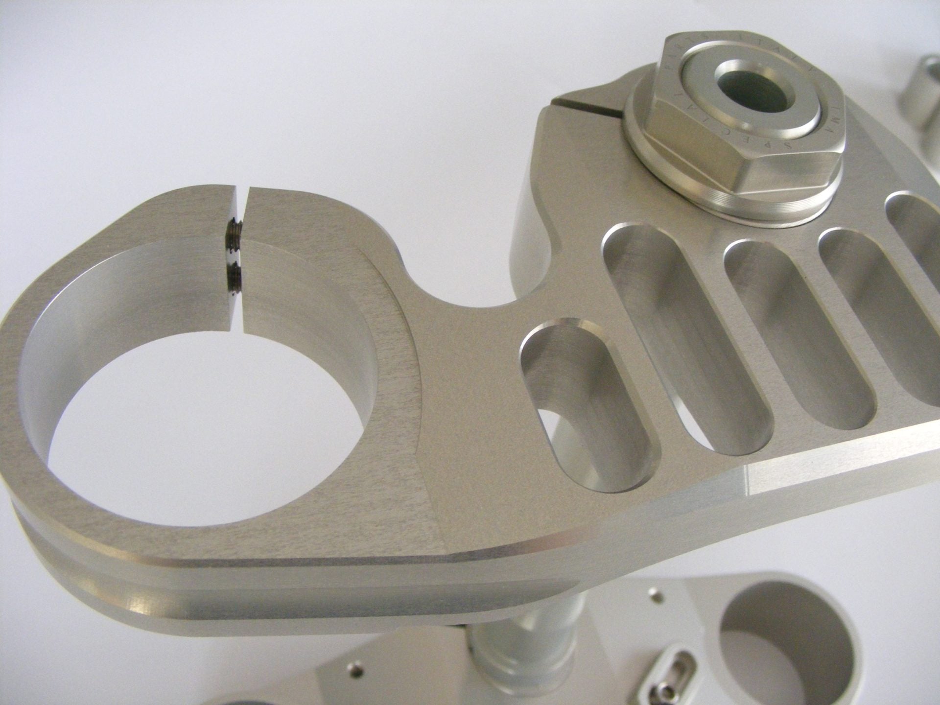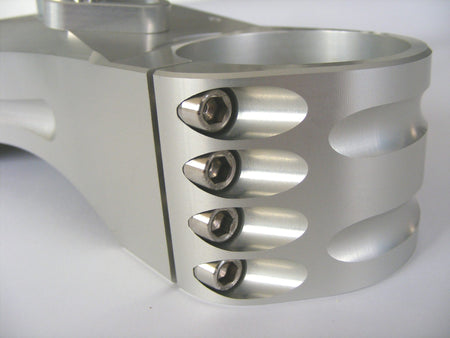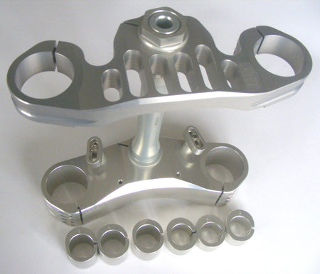 Billet Adjustable triple clamps, aimed at track enthusiast, developed to respond to the most recent studies on the chassis structural dynamics of new motorcycles. Thanks to their specific design/shape and to the higher material features, they work effectively in reducing the Chattering effect, conferring more precision, stability and cornering speed. Also, provided with 4 sets of bushings, they allow to adjust the offset modifying the trail without moving the rake of the bike, in order to set the bike up to the personal attitude or to the track features. Adjustable steering limiters.