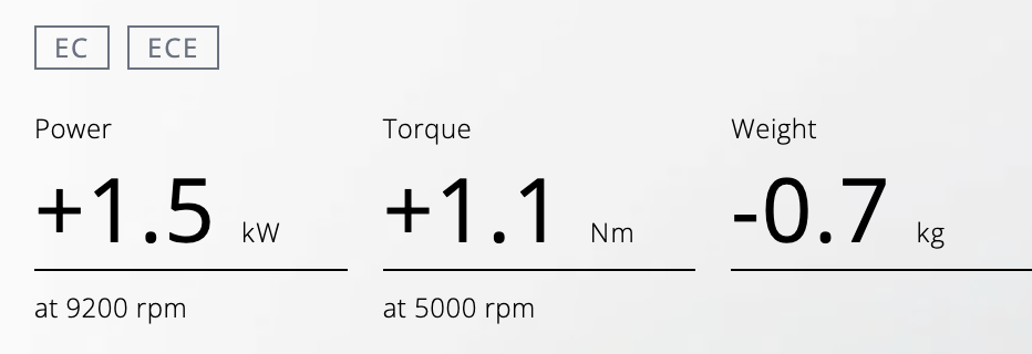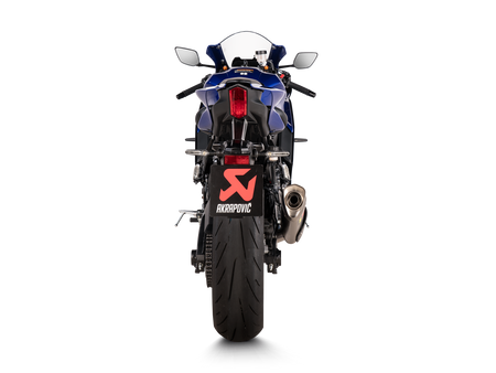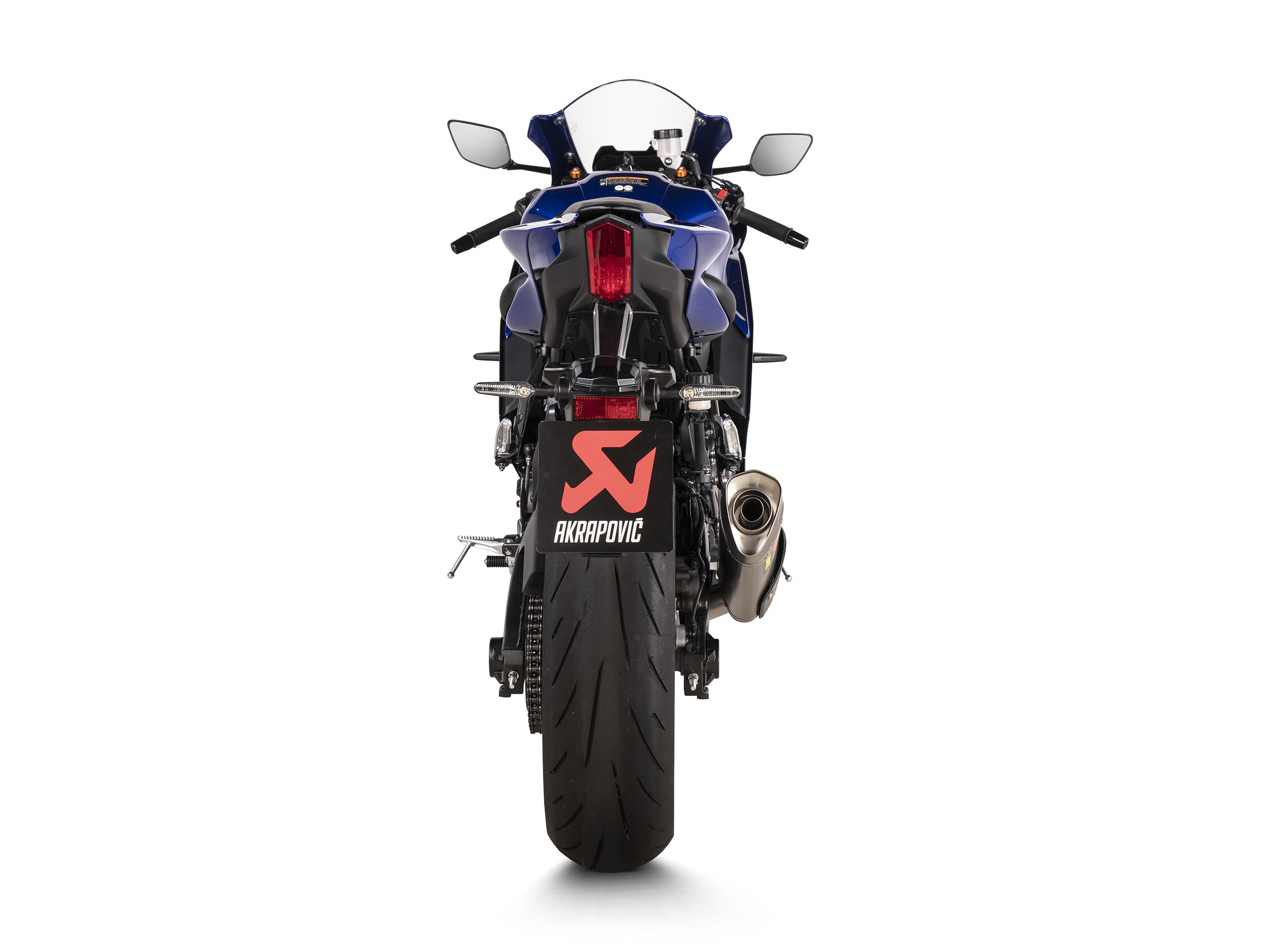 This is an EC/ECE type-approved complete exhaust system constructed with a high-grade, lightweight titanium outer sleeve and end-cap for the muffler, with a stainless steel link pipe and headers, weighing in at 0.7 kg lighter than the standard stock exhaust. A catalytic converter is included in the package, complying with the current Euro5 approvals. There are performance increases of 1.5 kW (2.0 hp) at 9,200 rpm and an added +1.1 Nm at 5,000 rpm when tested on the Akrapovič dyno against a standard stock exhaust. The deep, vivid sound complements the bike’s sporting credentials. Designed to match the bike’s lines, the pre-muffler is located under the main body and is hidden by the fairing, leaving the muffler to exit on the right side of the machine. The system is finished with a hand-crafted carbon-fibre heatshield.
