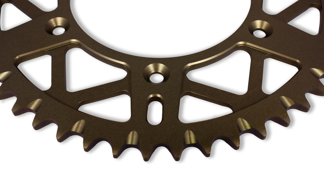 All aluminium sprockets are made from heat treated 7075-T6 aluminium. After precision machining and flattening they are hard anodised for durability and corrosion resistance.