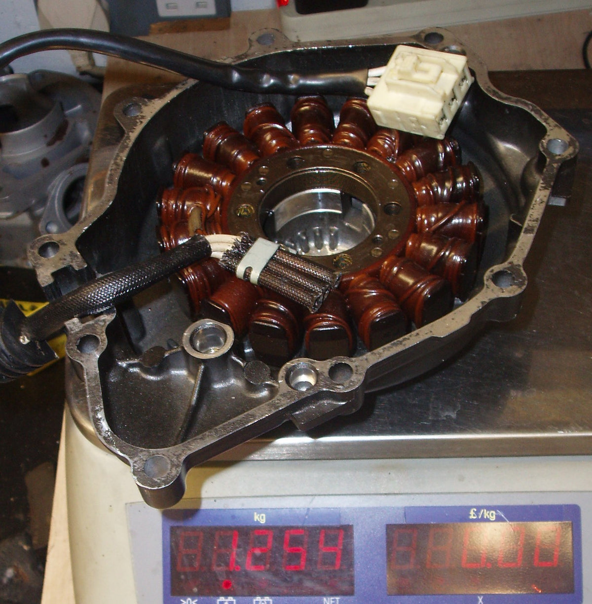 This state-of-the-art alternator uses a tiny 68mm diameter rotor (most of which is to hold the starter clutch), weighing only 276g as opposed to the original at 944g. This reduces the effective weight of the crank by not only reducing the weight of the rotor by 670g, but also by reducing the radius over which this weight acts.