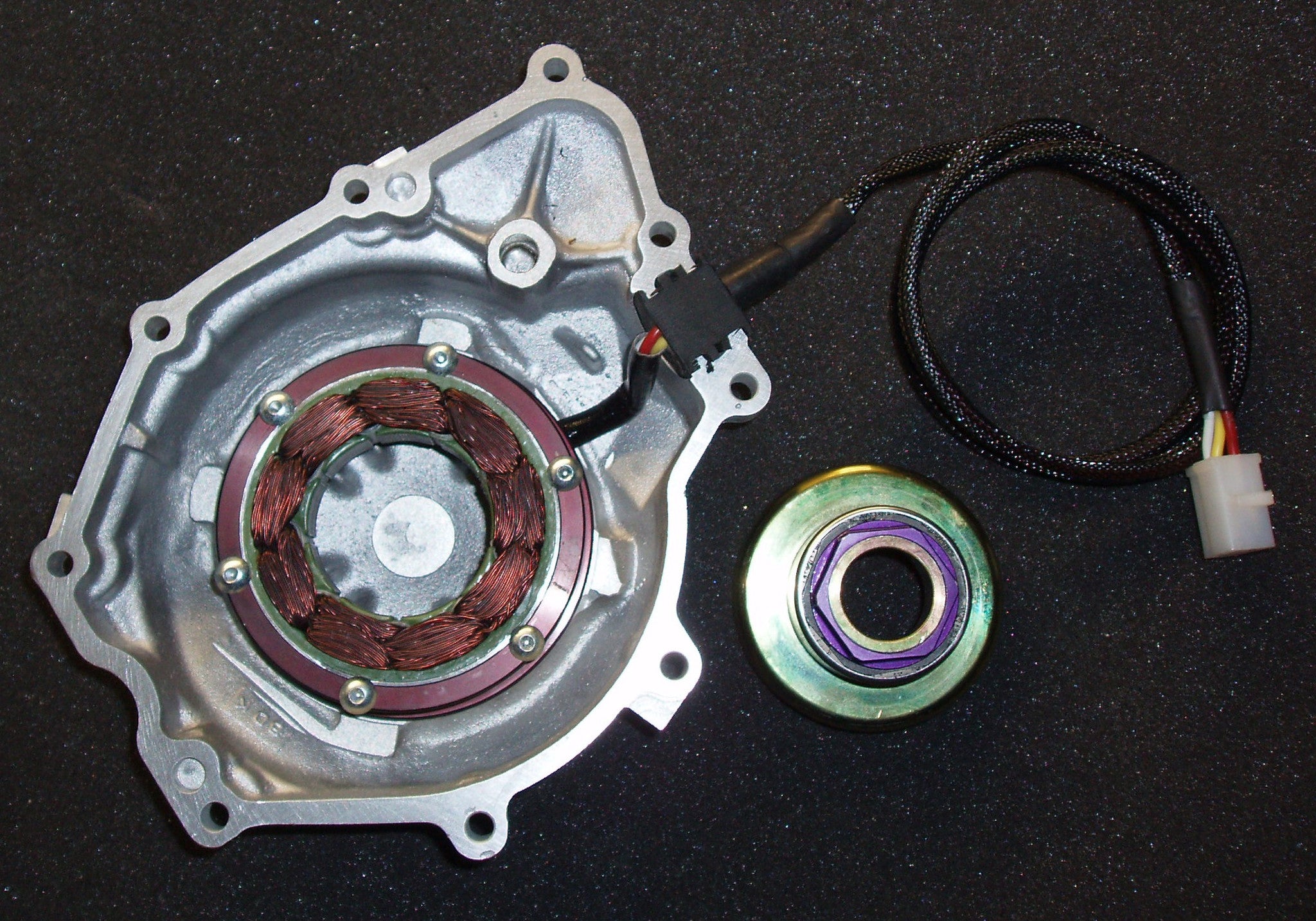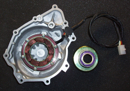 This is the complete race generator kit including the lightweight flywheel, high ground clearance race generator cover, stator, mounting plate, cup fasteners, connectors and specific regulator / rectifier.